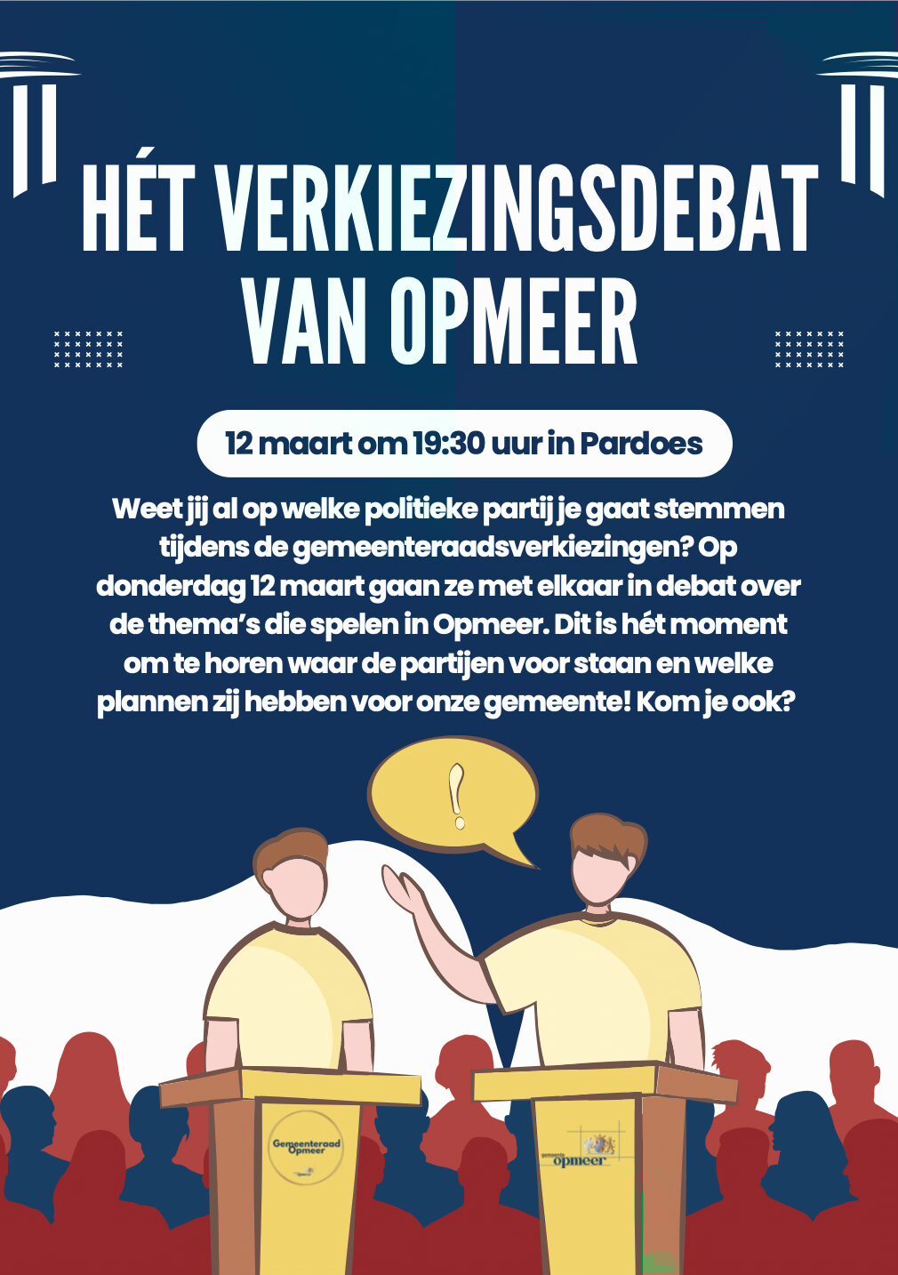 Weet jij al op welke politieke partij je gaat stemmen tijdens de gemeenteraadsverkiezingen? Op donderdag 12 maart gaan ze met elkaar in debat over de thema’s die spelen in Opmeer. Dit is hét moment om te horen waar de partijen voor staan en welke plannen zij hebben voor onze gemeente! Kom je ook?